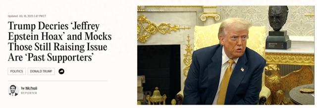 △美媒报道,特朗普称“爱泼斯坦”是骗局,并说,仍在对此深信不疑的支持者,再也不需要他们的支持了