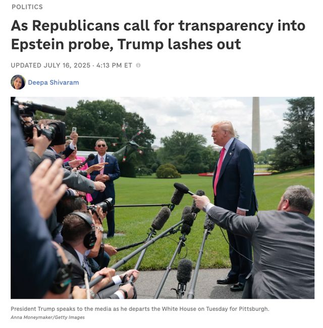 △美媒报道称,当地时间7月16日,针对共和党内一些仍在要求公布更多爱泼斯坦资料的成员,特朗普进行了严厉抨击