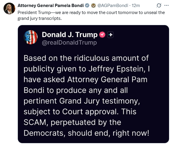17日,特朗普则发文称,鉴于爱泼斯坦事件被过度炒作,他已要求司法部长邦迪在法院批准下公布所有相关大陪审团证词。他称该事件是“民主党人炮制的骗局”,应“立刻结束”。在其发表声明后不久,邦迪在就社交媒体平台X上表示,司法部准备于18日请求法庭解封大陪审团的笔录。