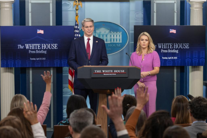 4月29日,美国白宫新闻秘书莱维特(右)与美国财政部长贝森特在华盛顿白宫出席记者会 图:新华社
