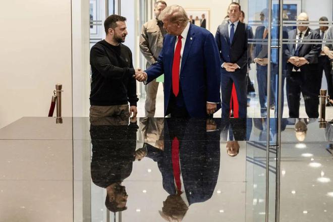在2024年联合国大会期间到访美国的泽连斯基(左)与当时赢得美国总统大选的特朗普在纽约特朗普大厦会面