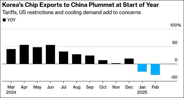 2025年前两个月,韩国对华芯片出口下滑(彭博社制图)