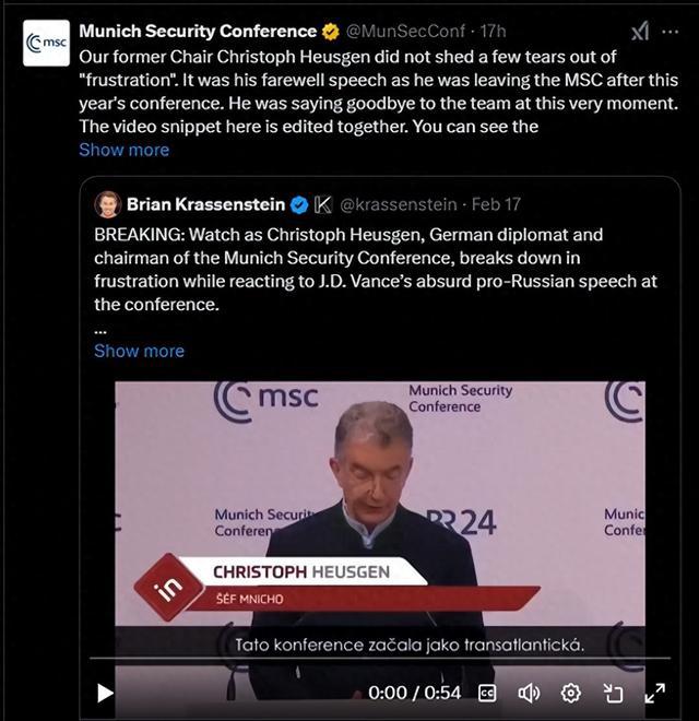 慕安会在其X账号发帖澄清慕安会主席克里斯托夫·霍伊斯根在慕安会闭幕式上落泪一事(图为慕安会X账号截图)