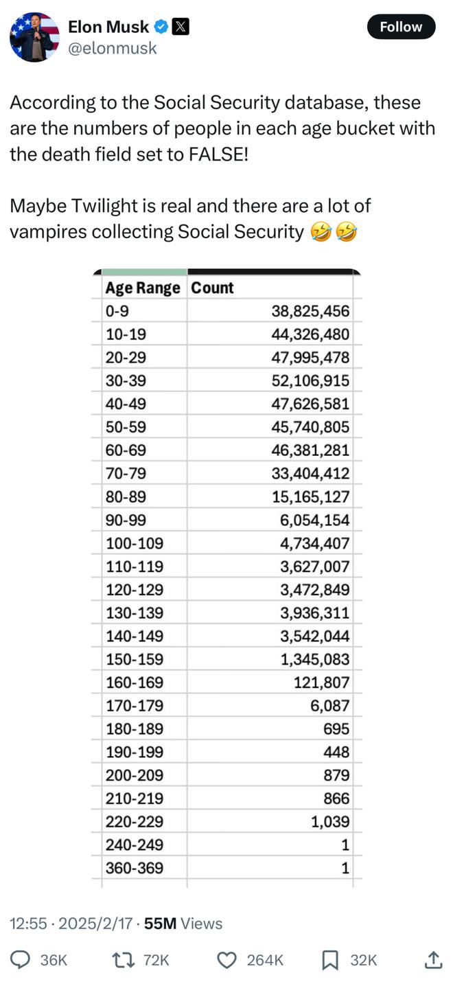 财联社2月18日讯(编辑 马兰)周一,美国政府效率部(DOGE)部长马斯克发布推特称,在美国社保数据库中找到荒诞数据,比... 财联社2月18日讯(编辑 马兰)周一,美国政府效率部(DOGE)部长马斯克发布推特称,在美国社保数据库中找到荒诞数据,比如为2000多万个百岁老人发放政府福利,其中一个年纪在240岁以上,另一个在360岁以上。