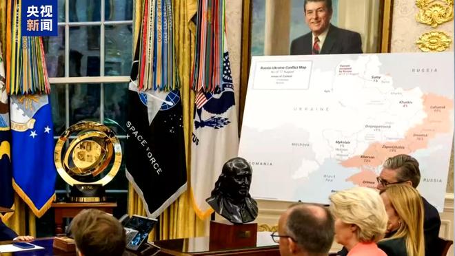 此外,根据媒体发布的现场照片,特朗普与泽连斯基在白宫椭圆形办公室会晤时,白宫展示出一张地图,二人在地图旁边观看。