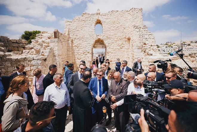 当地时间8月1日,德国外交部长瓦德富尔(中)访问以色列泰贝赫市