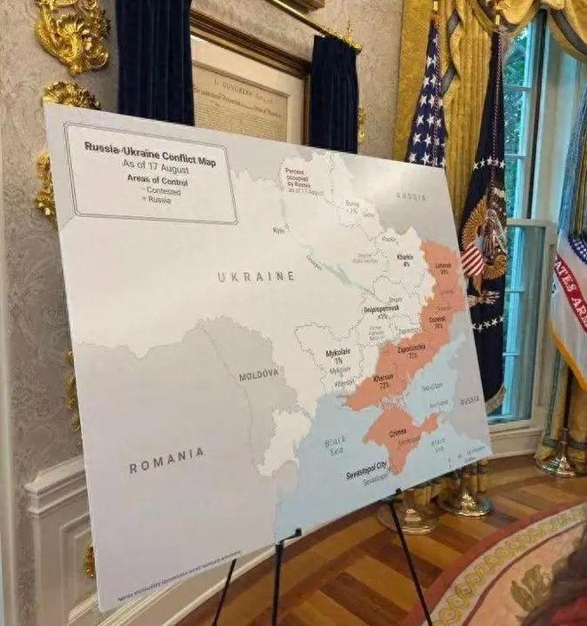 特朗普在白宫向泽连斯基展示的俄乌战场形势图,泽连斯基回到基辅后称,白宫展示的地图是错误的,然而,目前乌东四州大部分领土确实被俄罗斯占领