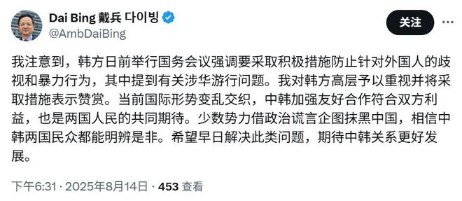 戴兵大使在帖文中说:“我注意到,韩方日前举行国务会议强调要采取积极措施防止针对外国人的歧视和暴力行为,其中提到有关涉华游行问题。我对韩方高层予以重视并将采取措施表示赞赏。当前国际形势变乱交织,中韩加强友好合作符合双方利益,也是两国人民的共同期待。少数势力借政治谎言企图抹黑中国,相信中韩两国民众都能明辨是非。希望早日解决此类问题,期待中韩关系更好发展。”