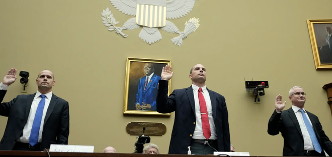 ▲莱恩(左一)出席美国国会UFO主题听证会