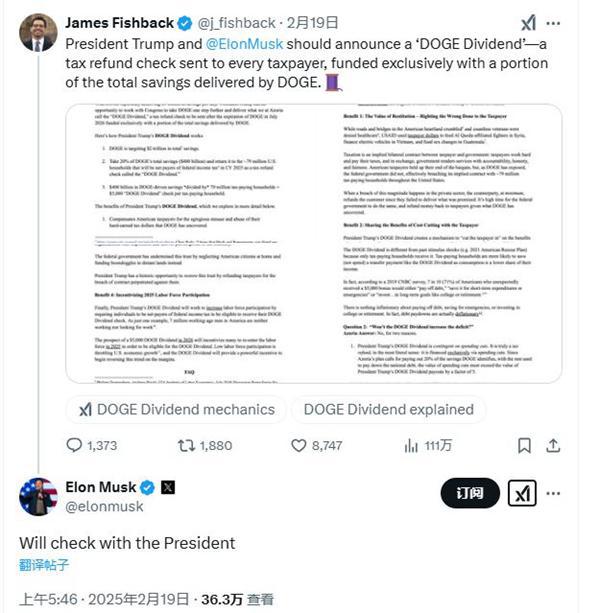 周三早些时候,菲什巴克在社交媒体发文,建议特朗普和马斯克把政府效率部省下来的钱拿出20%返还给7900万个纳税家庭。他计算,如果政府效率部能实现削减开支2万亿美元的目标,每户家庭将能获得5000美元的“分红”。