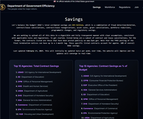 上周,美国政府效率部官方网站正式上线使用。根据该网站发布的声明,截至2025年2月17日,该部预计节约总额为550亿美元,其中包括取消租赁协议和合同或重新谈判、出售资产、取消补助金、裁员等。而这距离该部门此前设定的目标显然还有距离。