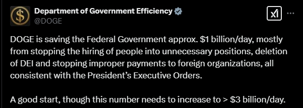 政府效率部此前发文称,该部门每天为美国节省约10亿美元,并称需要将节省数额提高到每天30亿美元以上。