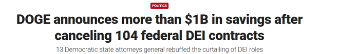 此后,政府效率部又在当地时间1月31日宣布,通过取消104份DEI相关合同,将节省超过10亿美元的开支。
