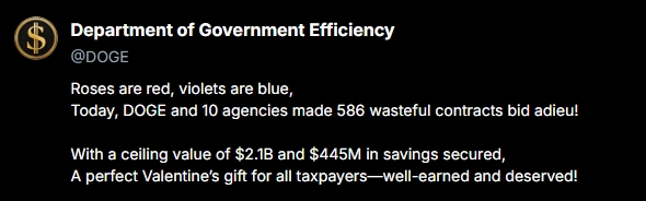政府效率部2月14日发布的最新数据称,取消了10个机构签订的586份合同,合同上限最高为21亿美元,其中包括一份近820万美元的合同,预估至少节省了4.45亿美元。由于这一消息是在当地时间2月14日发布的,该部门在社交媒体上称这是给美国纳税人的"情人节礼物"。