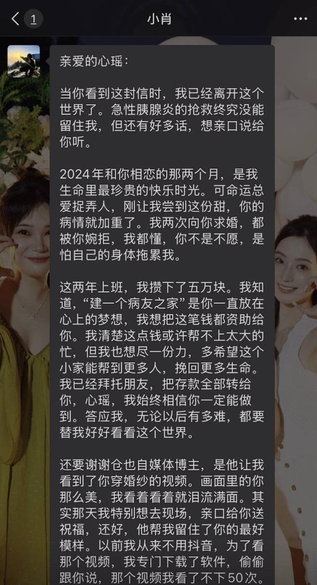 8月31日下午5点,胡心瑶收到一封来自前男友肖先生的遗书和5万元转账,此时肖先生已因急性重症胰腺炎,在华西医院抢救无效离世,年仅26岁。