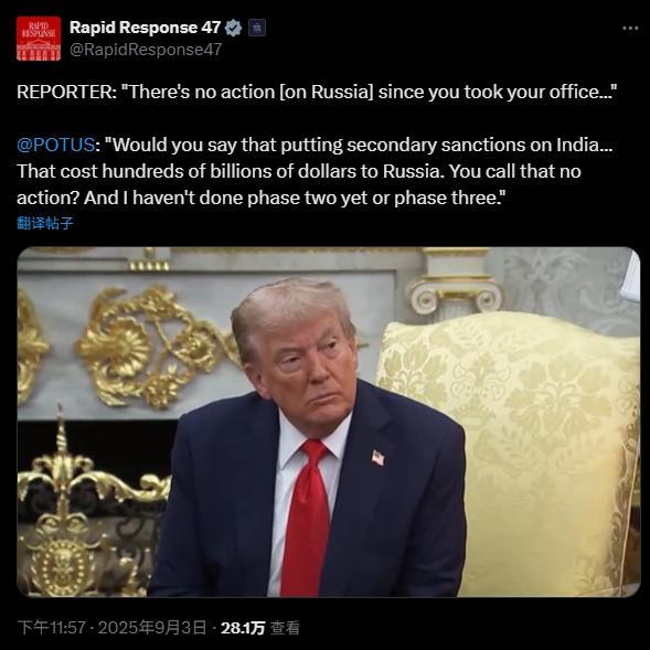 特朗普:“谁说我对俄没行动?我制裁印度了,这叫没行动?”