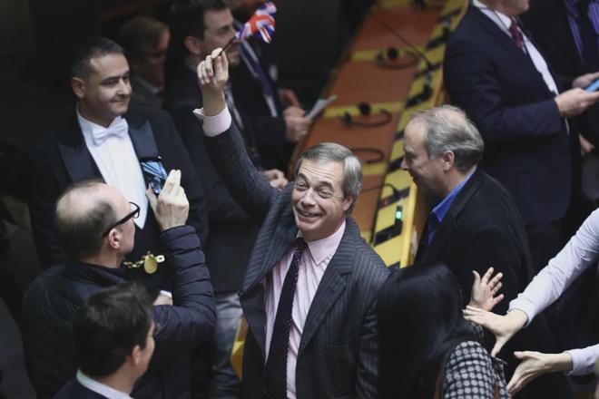 2020年1月29日,在比利时布鲁塞尔,英国“脱欧党”领袖、欧洲议会议员奈杰尔·法拉奇在英国“脱欧”协议投票结果公布后庆祝 新华社记者郑焕松摄