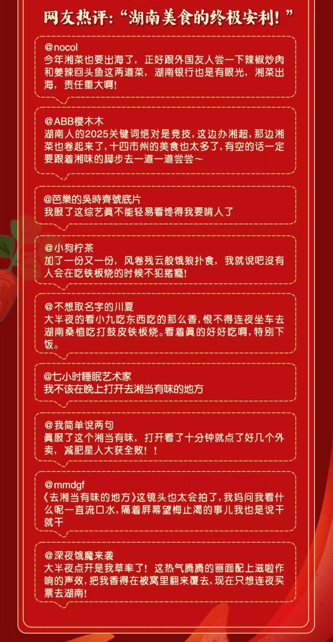 人民网、中国经济网、综艺报等行业权威媒体纷纷点赞,张家界、岳阳、长沙等地文旅官方账号持续发声,实现媒体、行业与地方三圈层共振,彰显出节目广泛的社会影响力。