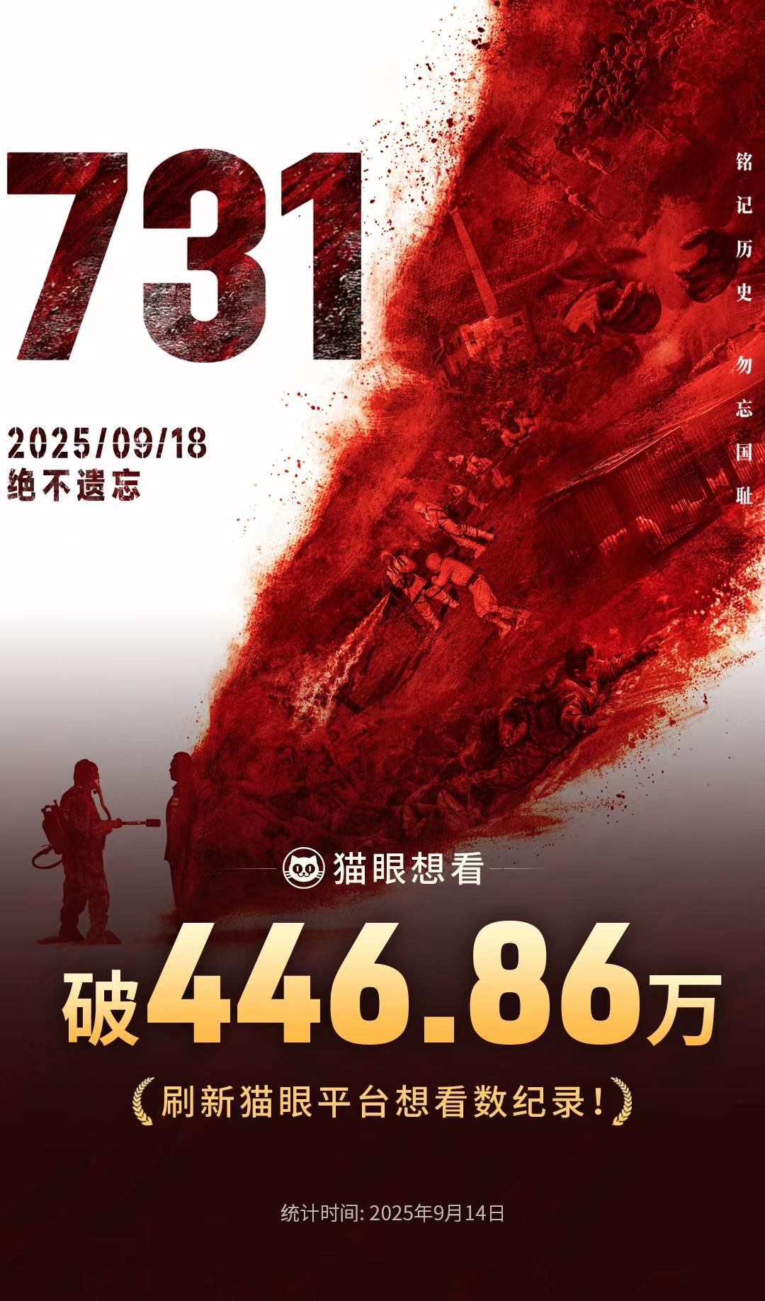 9月14日晚8时,猫眼专业版发布最新数据:电影《731》的“想看数”突破446.86万,超越4年前公映的电影《唐人街探案3》,刷新该平台“想看数”纪录。