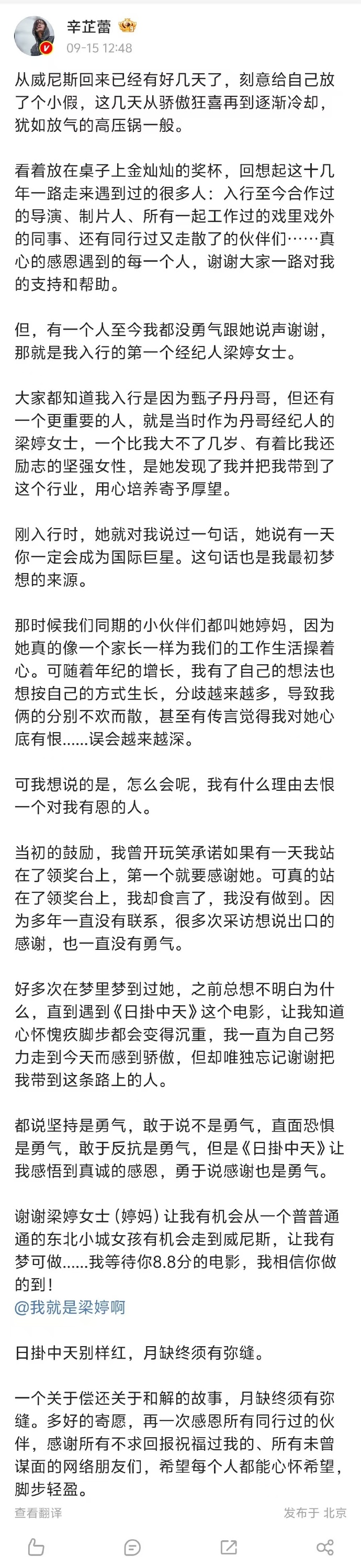 9月15日,辛芷蕾写下长文,感谢自己入行的第一个经纪人梁婷。她说,刚入行时对方就曾说有一天自己一定会成为国际巨星,这句话也成为她梦想的来源。后来两人分歧越来越多,导致不欢而散,有传言说对她心里有恨,“可我想说的是,怎么会呢,我有什么理由去恨一个对我有恩的人。”