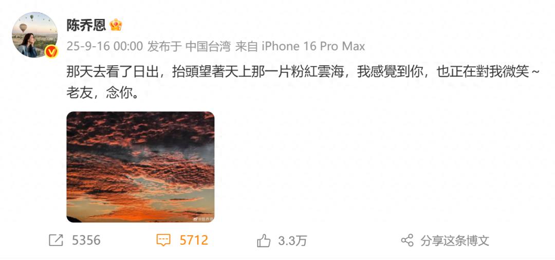 陈乔恩连续九年晒粉色天空悼念乔任梁:我感觉到你,也正在对我微笑 访客 2025-09-16 15:03:29 18062 默认 摘要: 9月16日是乔任梁去世九周年,陈乔恩像往年一样晒出粉色天空悼念他:“抬头望着天上一片粉红云海,我感觉到你,也正在对我微笑... 9月16日是乔任梁去世九周年,陈乔恩像往年一样晒出粉色天空悼念他:“抬头望着天上一片粉红云海,我感觉到你,也正在对我微笑~老友,念你。”乔任梁生前喜欢粉色,所以陈乔恩每年的9月16日都会发一张粉红色天空的照片。 标签: 粉色 都会 海报 阅读 QQ 分享 微博分享 微信分享 分享 上一篇25岁男子被捕!47岁女星自曝遭性侵偷拍,最新进展 下一篇苏永康演唱会遭遇抵制 大麦网已无苏永康在售演出 25岁男子被捕!47岁女星自曝遭性侵偷拍,最新进展上一篇 苏永康演唱会遭遇抵制 大麦网已无苏永康在售演出下一篇 相关推荐 粉色都会 知名主持人杨乐乐被紧急送医! 2025-10-10 男星范世錡成都演唱会取消,工作室致歉:系身体原因;此前否认与于朦胧坠亡有关,因被造谣报警 2025-10-10 上热搜了,李莎旻子拥有“管乐同款家”! 2025-10-10 李昀锐新剧“癫位”出道?《宴遇永安》今日开播 2025-10-10 透过“密逃”小窗洞见鲜活世界,“综N代”突破?它在这样做 2025-10-10 从电影《刺杀小说家2》看中国奇幻故事创作与表达 2025-10-10 疑似金钟国妻子最新曝光!金钟国视频里的酒店玻璃门反射出一个年轻女性身影;本人曾否认妻子和自己年龄差20岁 2025-10-10 翁虹为18岁女儿办中式成人礼,泪洒现场! 2025-10-10