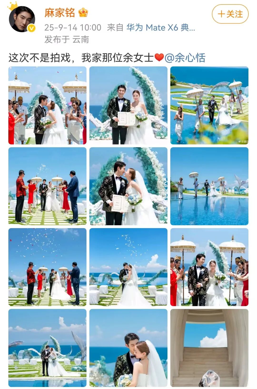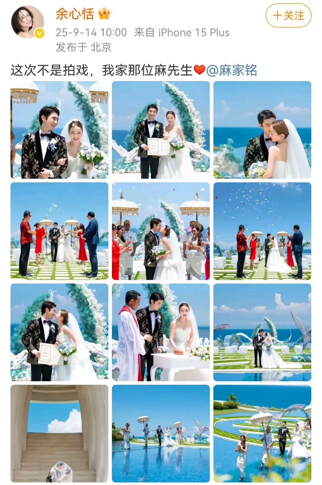 当天,两人在社交平台晒出多张婚礼照,并配文:这次不是拍戏。