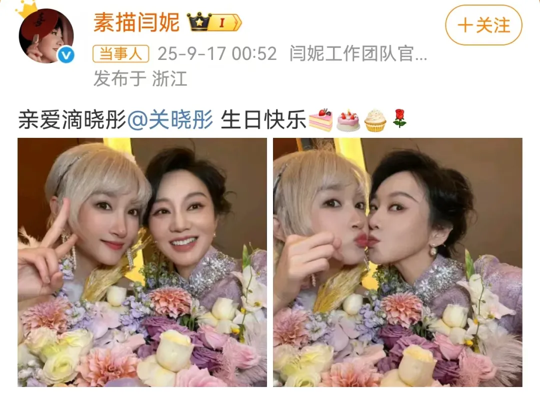 9月17日,演员闫妮在社交平台上晒出两张与关晓彤的合照,并配文:亲爱滴晓彤,生日快乐。