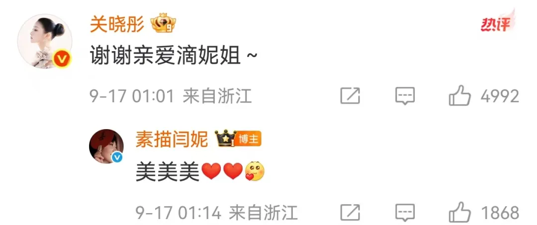 关晓彤则在评论区回复:谢谢亲爱滴妮姐。