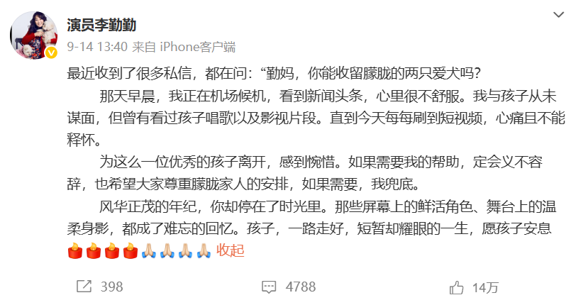 9月17日上午,大皖新闻记者就此联系到李勤勤方,工作人员卢先生回应称,暂时还没有和于朦胧方对接此事,“后续如果有需要,我们可以帮忙。”于朦胧不幸离世后,不少人担心他留下的两只爱犬没人照顾,纷纷给曾收养周海媚宠物的演员李勤勤私信,希望她能收养于朦胧的爱犬。9月14日,李勤勤在社交媒体发文回应,表示“如果需要我的帮助,定会义不容辞,也希望大家尊重朦胧家人的安排,如果需要,我兜底。”