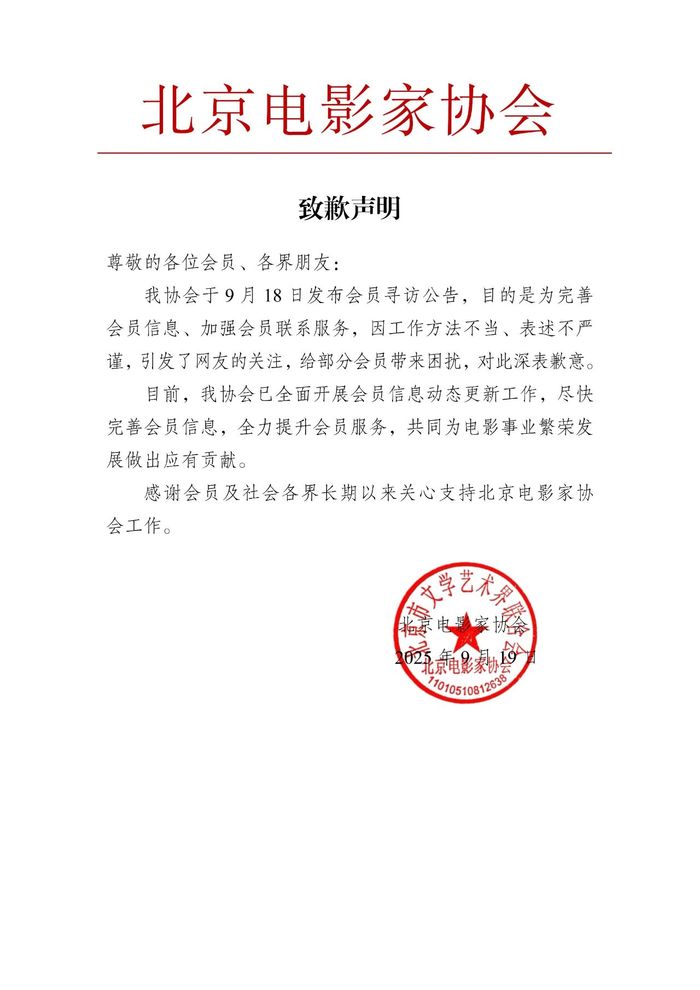 9月19日,北京电影家协会发布致歉声明称,协会于9月18日发布会员寻访公告,目的是为完善会员信息、加强会员联系服务,因工作方法不当、表述不严谨,引发了网友的关注,给部分会员带来困扰,对此深表歉意。目前,协会已全面开展会员信息动态更新工作,尽快完善会员信息,全力提升会员服务,共同为电影事业繁荣发展做出应有贡献。