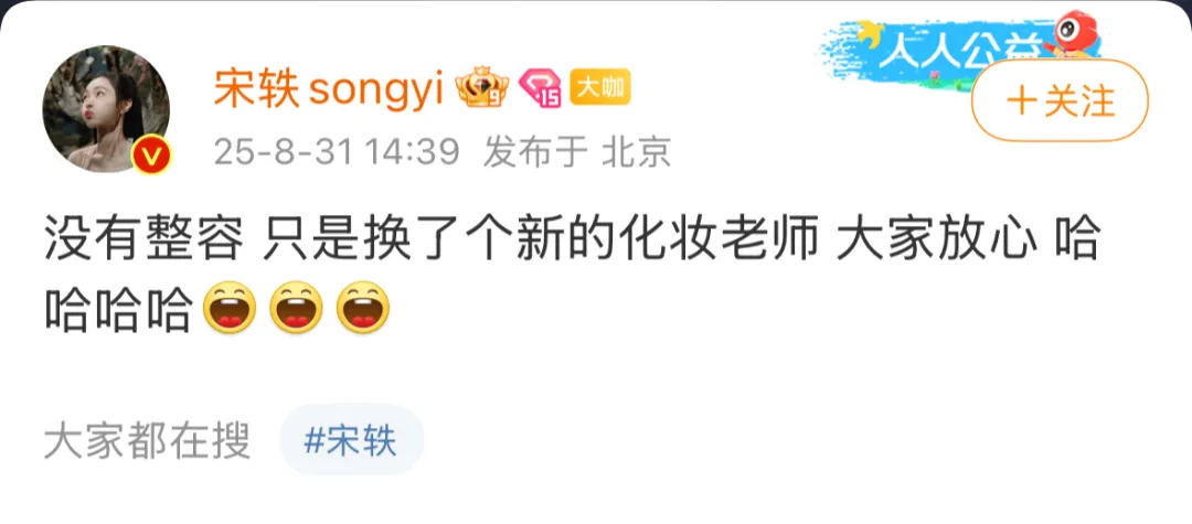 此前8月31日,演员宋轶发文回应争议:没有整容,只是换了个新的化妆老师。没有刻意减肥,只是因为工作强度比较大,但是每天都在好好吃饭哦(其实只瘦了2斤) 。