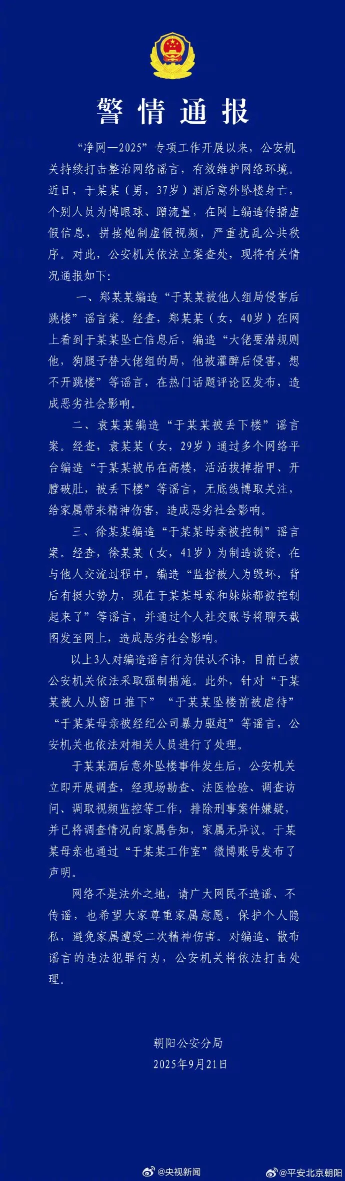 9月21日,北京朝阳警方通报查处一批涉于朦胧坠楼谣言。通报称于某某(男,37岁)酒后意外坠楼身亡,个别人员为博眼球、蹭流量,在网上编造传播虚假信息,拼接炮制虚假视频,严重扰乱公共秩序。对此,公安机关依法立案查处。