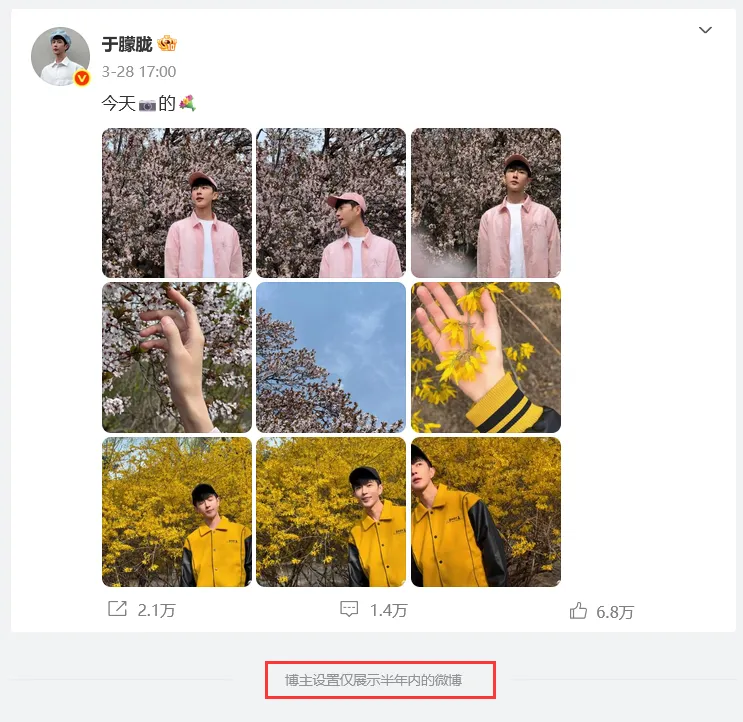 于朦胧的微博永远停留在了2025年9月3日,目前能够看到的最早一条微博,则是2025年3月28日他发布的春日花海九宫格。