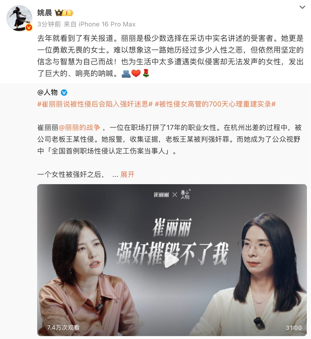 演员姚晨为崔丽丽发声:她为生活中太多遭遇类似侵害却无法发声的女性,发出了巨大的、响亮的呐喊
