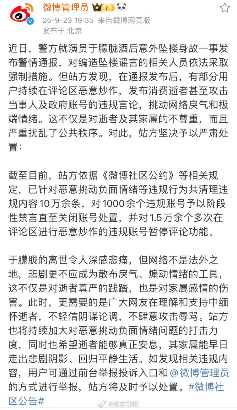 9月23日晚,@微博管理员 发布信息提到,近期,在北京朝阳警方通报于朦胧酒后意外坠楼身故一事后,依然有部分用户持续在评论区发布消费逝者甚至攻击当事人及政府账号的违规言论,因此,对1000余个违规账号予以阶段性禁言直至关闭账号处置,并对1.5万余个多次在评论区进行恶意炒作的违规账号暂停评论功能。