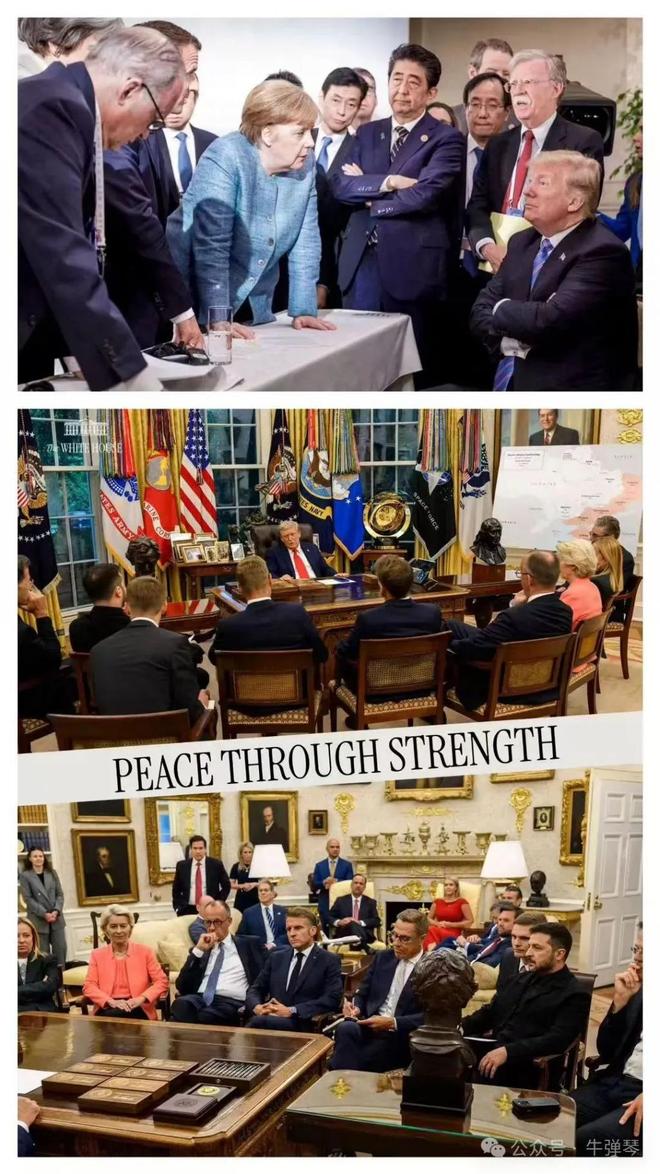 有评论调侃称上图是“六大门派围攻光明顶”,下图是“欧洲七大佬去白宫听课”