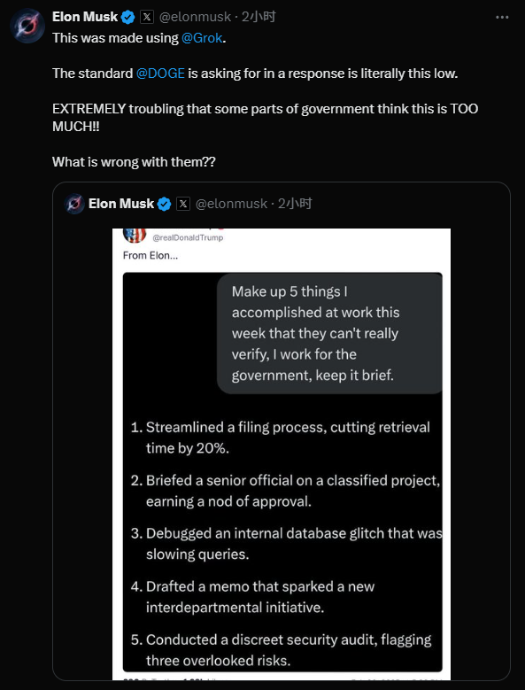 特朗普晒马斯克提交的“周报”,马斯克转发表示,“DOGE要求实际就这么低”