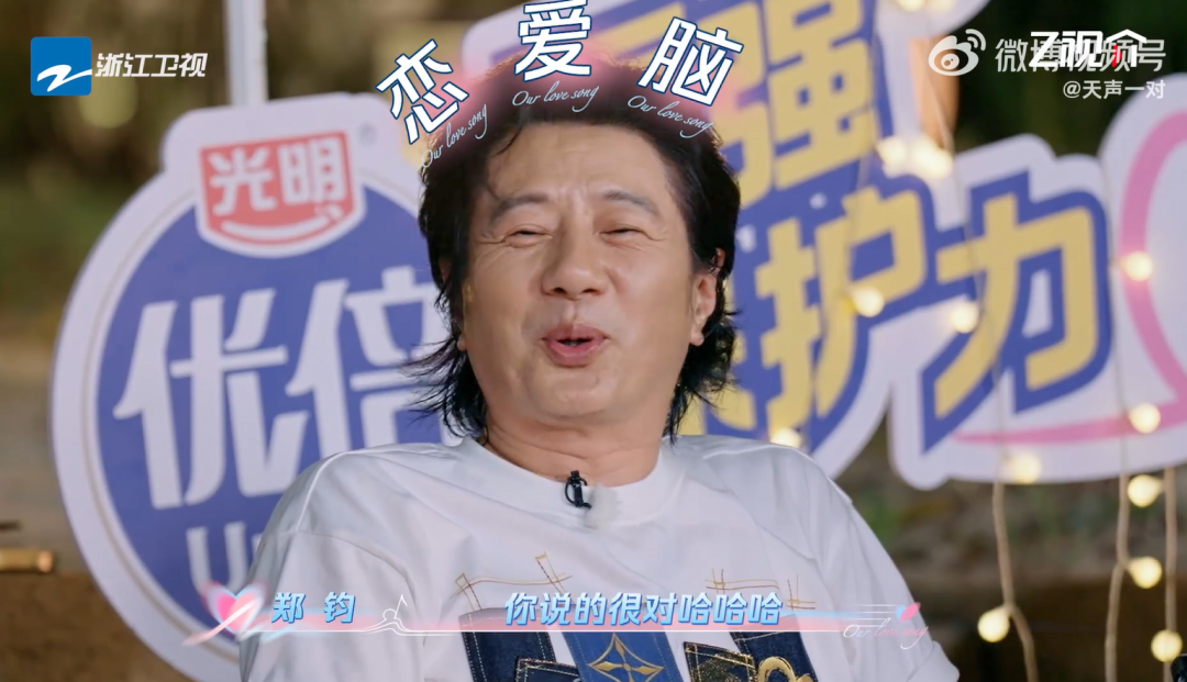 郑钧自嘲是为混迹在剧组,混个盒饭什么的。陈乔恩则打趣郑钧:其实你是真正的“恋爱脑”。郑钧也不反驳:你说得对。