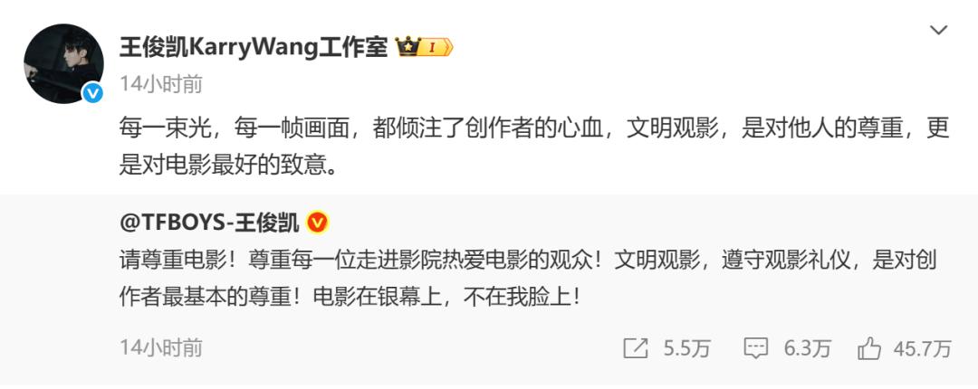 9月25日,王俊凯发文呼吁大家文明观影:“请尊重电影!尊重每一位走进影院热爱电影的观众!文明观影,遵守观影礼仪,是对创作者最基本的尊重!电影在银幕上,不在我脸上! ”