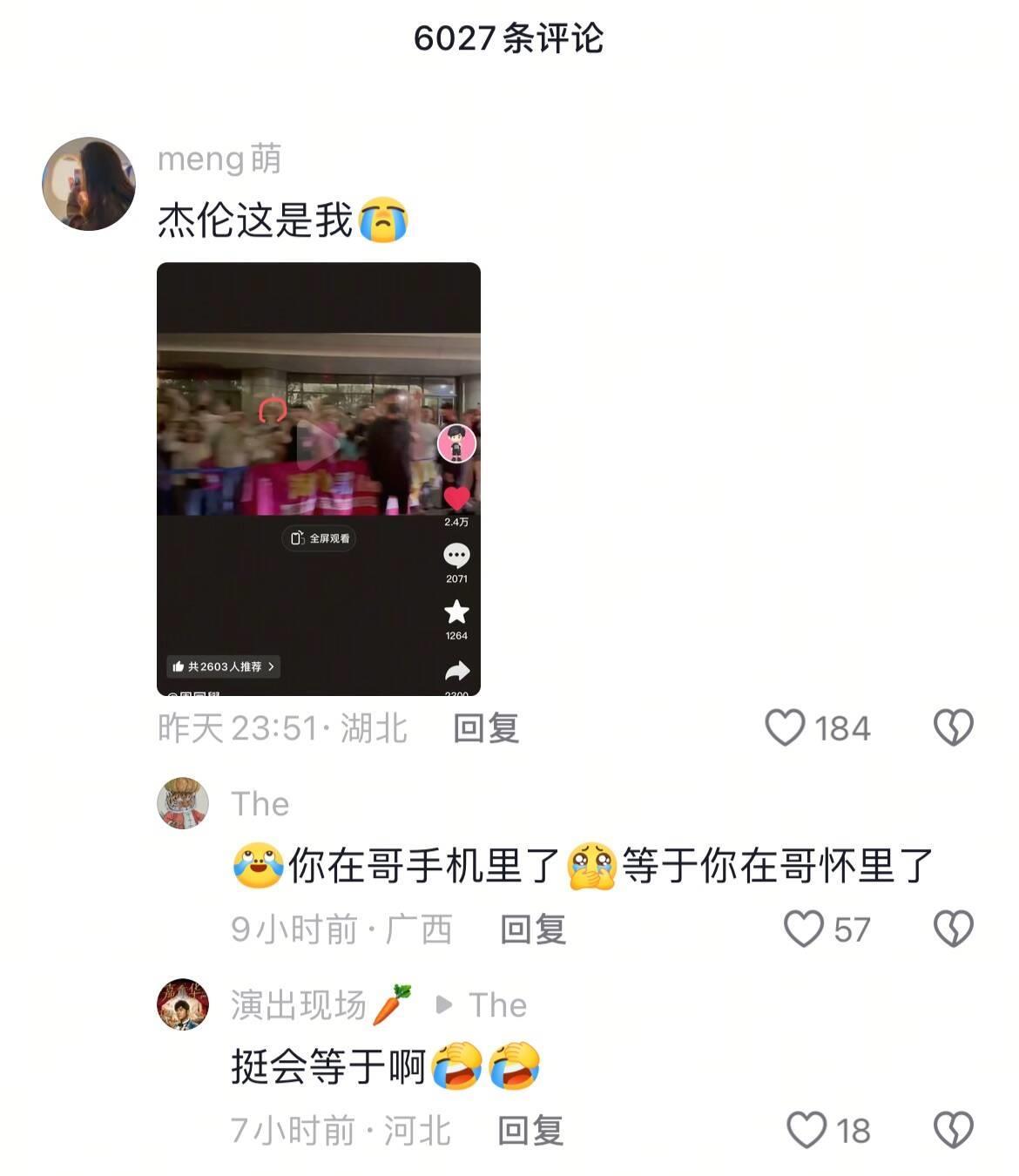 有网友关注到,周杰伦发布的这则视频时长仅1秒,但即便如此,还是有歌迷认出了自己并截图喊话:杰伦,这是我!