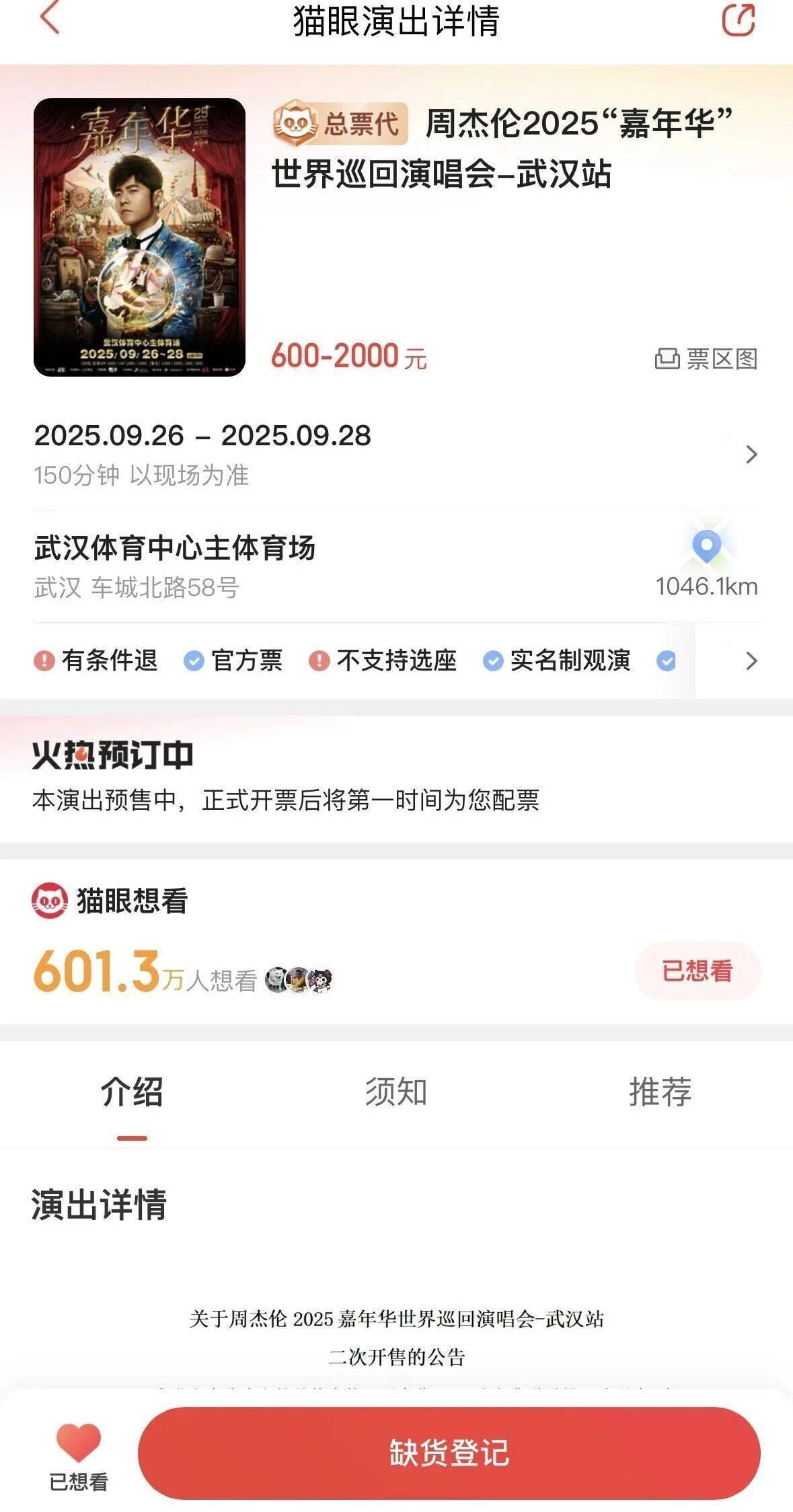 此前,周杰伦这场演唱会在猫眼的想看人数一度突破600万,猫眼平台曾提到,这不仅是猫眼平台以及武汉历史上想看人数最多的演唱会,也是2025年目前为止,想看人数最多的演唱会。