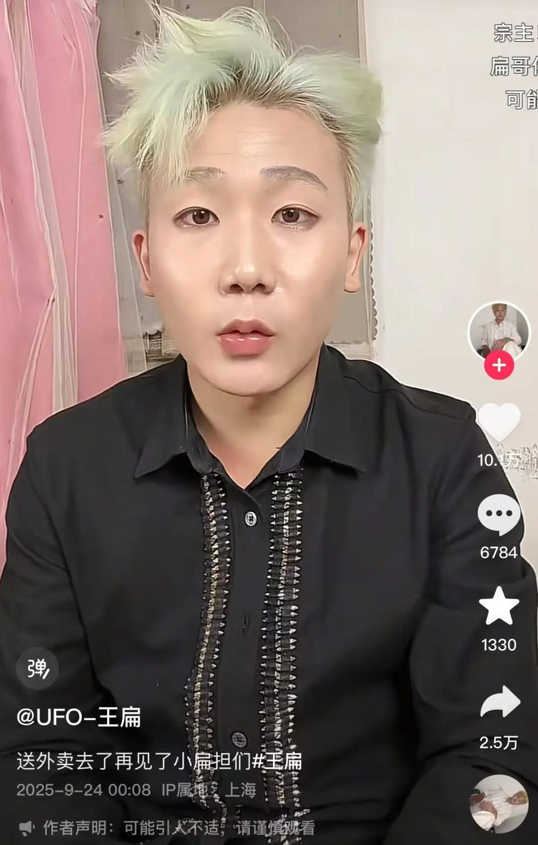 9月24日,“UFO-王扁”在社交平台发视频称,“送外卖去了再见了小扁担们”。