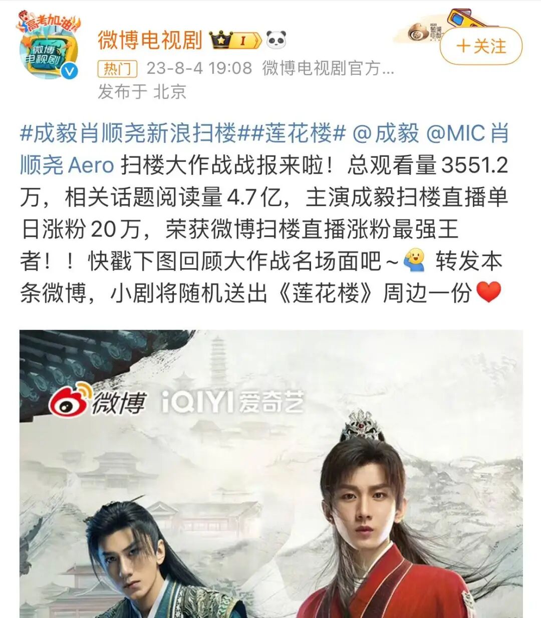 值得一提的是,2023年8月,《莲花楼》播剧期间,成毅曾实现单日涨粉20万的成绩。