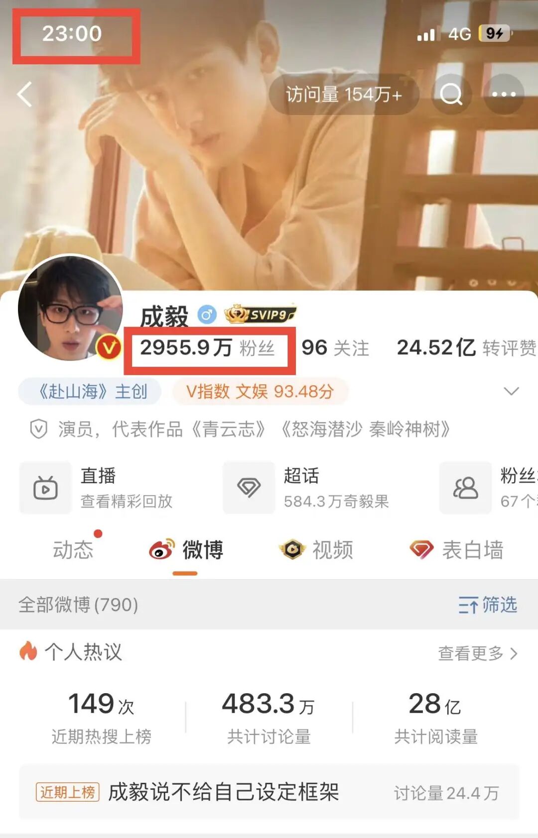 9月11日中午12点,粉丝曾为成毅记录下当时的微博粉丝量2950.4万;9月19日,剧集播出过半时成毅粉丝量上升到2954万;26日23:00,超点大结局之后,成毅粉丝为2955.9万。