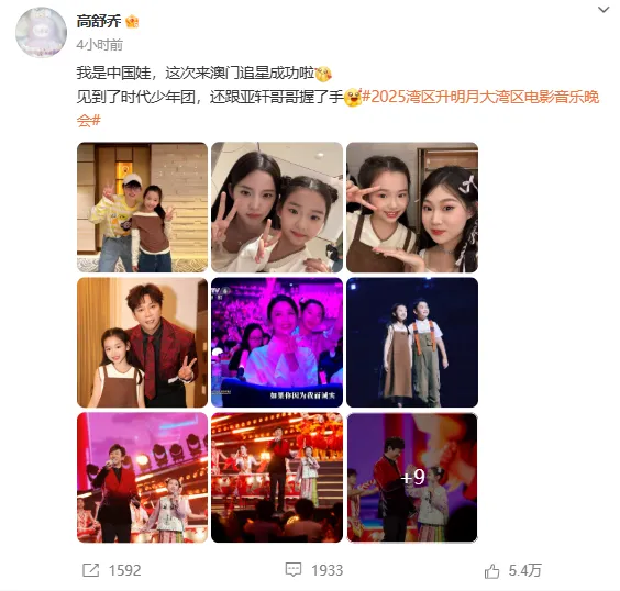 9月29日,董璇女儿小酒窝(高舒乔)在社交平台发文晒图:“我是中国娃,这次来澳门追星成功啦!”相关话题冲上热搜,网友:实现了不少粉丝的 “梦想”~