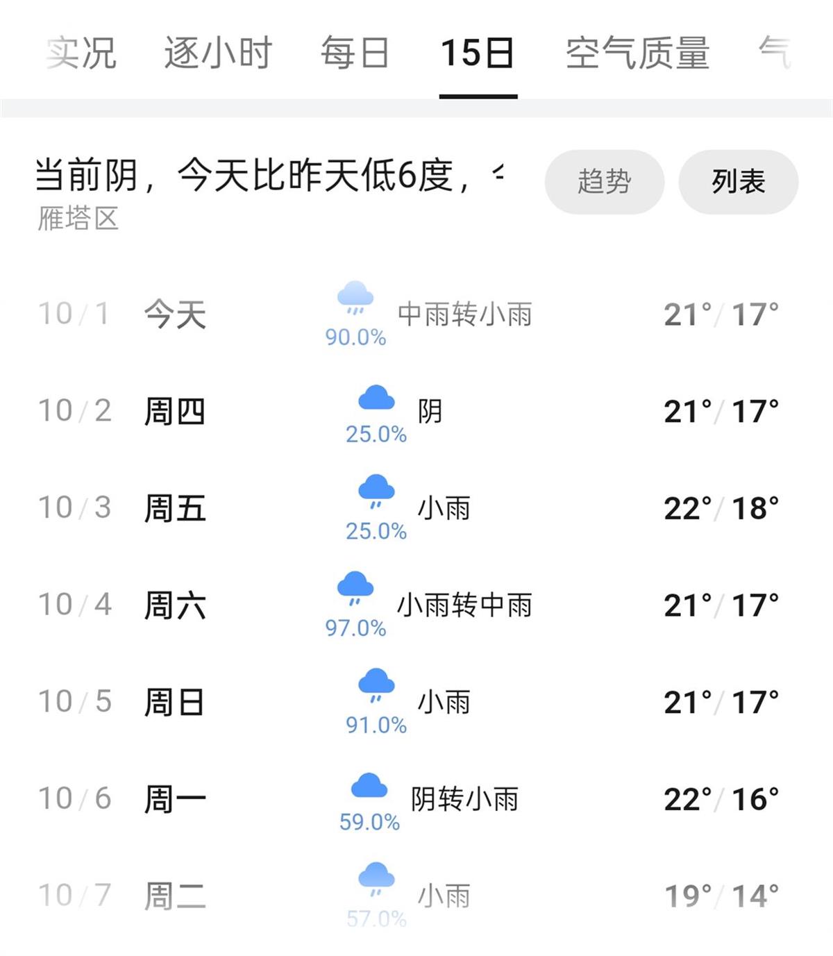天气APP显示,国庆期间,西安多以阴雨天气为主,甚至整个十月上旬都难见到太阳。网友们纷纷留言:“这下找到西安下雨的原因了。”