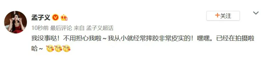 孟子义本人发文报平安:我没事哒!不用担心我啦~我从小就经常摔跤非常皮实的!嘿嘿。已经在拍摄啦哈~