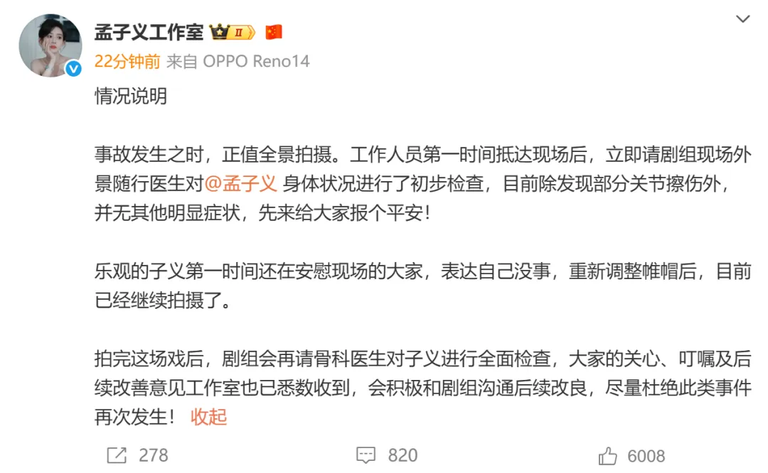 这次确实是我的疏忽,会吸取教训,后续注意剧组安全,再次向孟姐道歉!