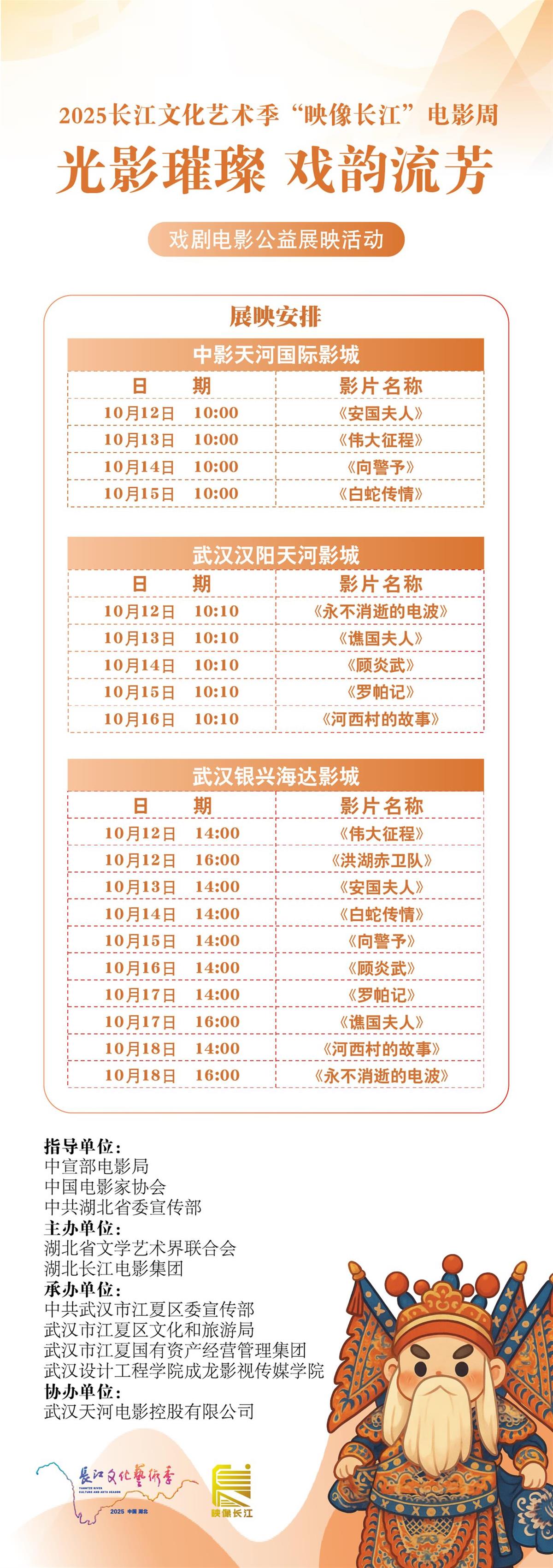 戏剧电影公益展映也将于10月12日同步启动,《伟大征程》《安国夫人》《顾炎武》《永不消逝的电波》《谯国夫人》《白蛇传·情》《向警予》《河西村的故事》《罗帕记》《洪湖赤卫队》(修复版)等多部优秀戏剧电影将在中影天河国际影城、武汉汉阳天河影城、武汉银兴海达影城与观众见面,广大影迷可直接到展映影城领票,免费观影。