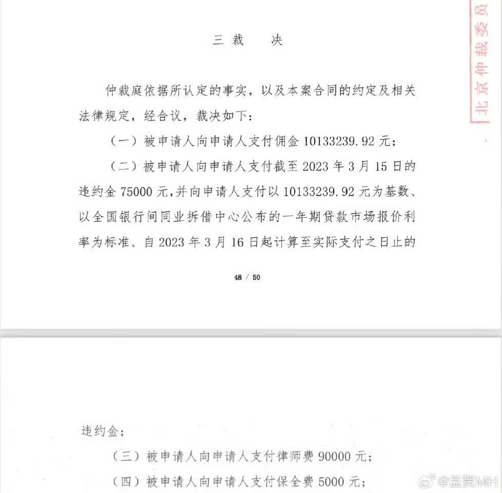 2024年10月12日,南方日报报道,由其中一方提供的北京仲裁委员会判决书显示,由汪小菲创办的麻六记的运营主体(即被申请人北京食通达科技发展有限公司)支付申请人孟贺及孟贺的北京呱呱香文化传媒有限公司佣金10133239.92元,同时支付违约金共计60万余元。除去一些其他费用开支及违约责任,实际麻六记赔付760万余元。